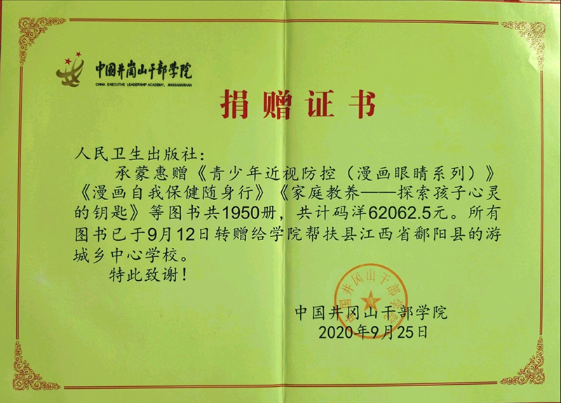 为响应国家健康扶贫号召,积极履行社会责任,人民卫生出版社于2020年9月向中国井冈山干部学院捐赠图书1950册,共计码洋6万余元。为此,中国井冈山干部学院以捐赠证书的形式向人民卫生出版社表示了感谢。
